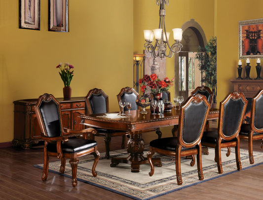 You can tell this is a high-quality set just by the weight of it. The wood grain is gorgeous and the formal design looks much more expensive than it actually was. The 6 side chairs fit perfectly around the table without feeling crowded. Truly a grand set for a formal dining room